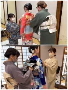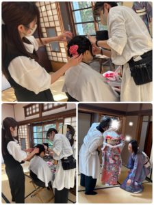 着付けは2人で手際よく、帯は一人一人違う帯結び、帯締めも可愛く素敵です。