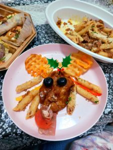 オードブルで好きなものを取って食べてねと言うと、お皿でトナカイを作っていました!